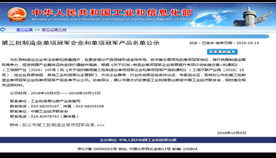 10 月8 日,工业和信息化部产业政策司公布了《关于第三批制造业单项冠军企业和单项冠军产品名单公示》,新疆半岛在线体育网-半岛(中国)公司根据《关于印发< 制造业单项冠军企业培育提升专项行动实施方案> 的通知》(工信部产业〔2016〕105 号)和《关于组织推荐第三批制造业单项冠军企业和单项冠军产品的通知》(工信厅联产业函〔2018〕19 号)要求,组织材料申报了制造业单项冠军产品- 异亮氨酸,截至目前已顺利通过审核并公示,公示于10 月15 日结束。异亮氨酸单项冠军产品的成功授予, 将形成全球市场、技术等方面领先的单项冠军地位,提升新疆半岛在线体育网-半岛(中国)公司的国际竞争力。